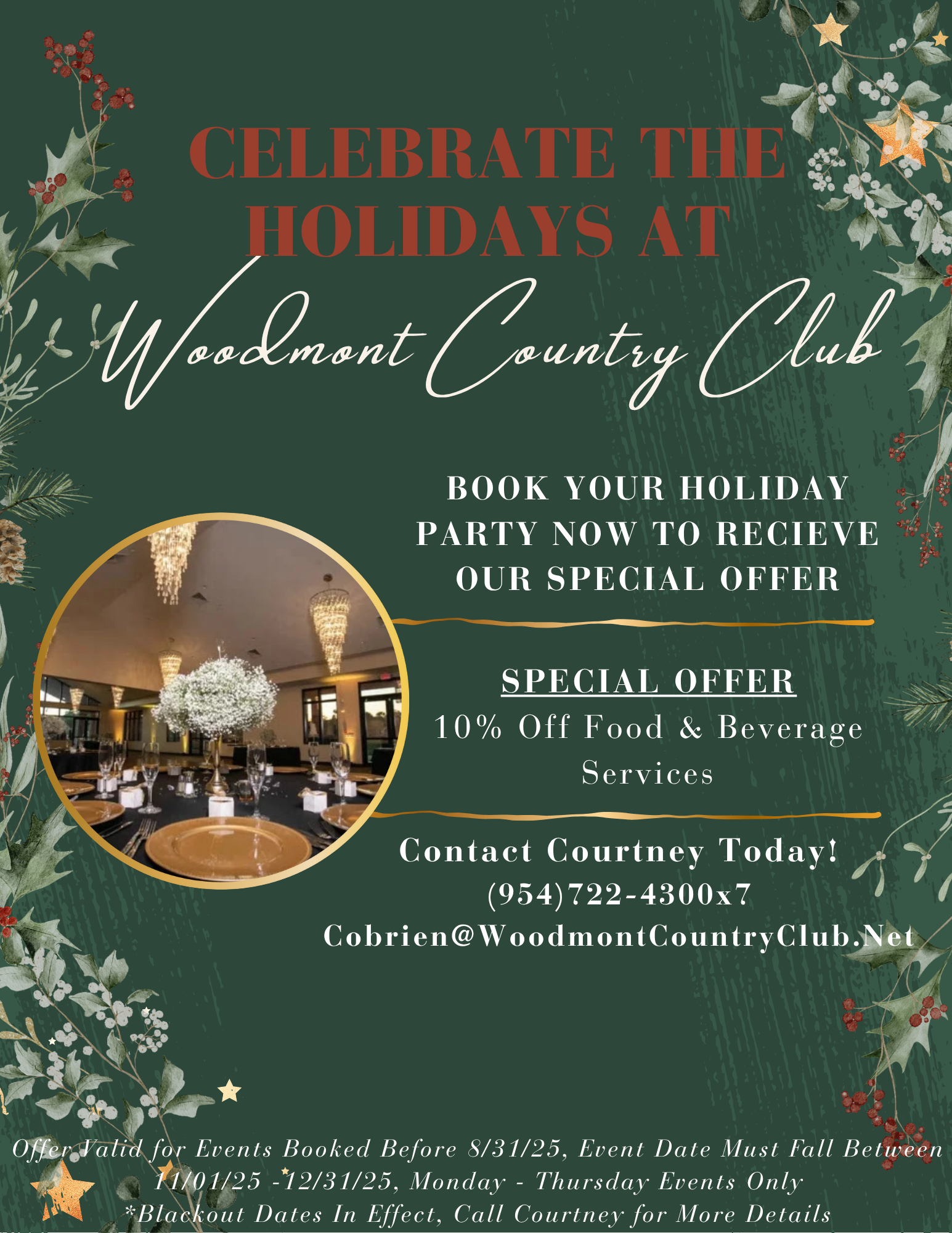 Have your special occasion, weddings, corporate meeting, club gathering, or reunion at the Woodmont Country Club, and we’ll ensure it’s a success! We can help with any banquet or special meeting needs you may have. We have a complete set of services to make your meeting a success and have planners to assist you to ensure everything goes smoothly.